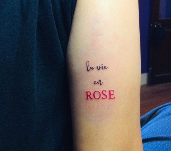 Mình xăm hình này vào một chiều ở Đà Lạt trong một tiệm xăm màu tím tìm trên Facebook của một người bạn, và hữu duyên lại gần với nhà Anh. Ý nghĩa tiếng Pháp của nó đơn giản là cuộc sống màu hường nhưng với mình không chỉ như vậy.